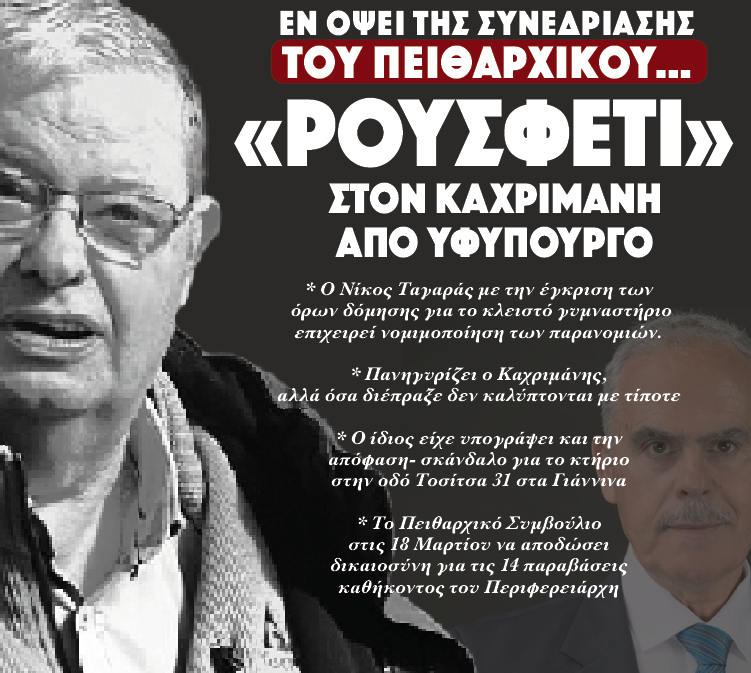 Ο «Τύπος Ηπείρου», που είχε αποκαλύψει όλα τα « περίεργα» της αγοράς (που είχε παρουσιαστεί ως δωρεά) υλικών από το πρώην κλειστό ξιφασκίας των Ολυμπιακών Εγκαταστάσεων και την προμήθεια παρόμοιων σχεδόν υλικών για τους στάβλους Καχριμάνη, δεν έχει καμιά αμφιβολία ότι η έγκριση των όρων δόμησης που υπέγραψε ο υφυπουργός Περιβάλλοντος και Ενέργειας Νικ. Ταγαράς, πρόκειται για εξυπηρέτηση προς τον Καχριμάνη εν όψει της Συνεδρίασης του Πειθαρχικού Συμβουλίου την Τετάρτη 18 Μαρτίου.