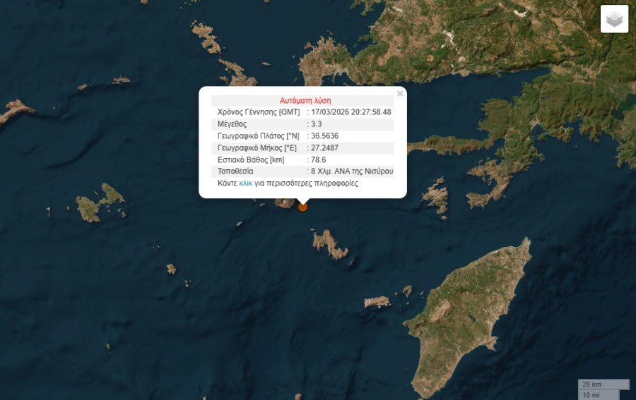 Σεισμός μεγέθους 3,3 ρίχτερ σημειώθηκε στη Νίσυριο. Η δόνηση σημειώθηκε στις 22:27 και είχε επίκεντρο 8 χλμ. ΑΝΑ της Νισύρου.