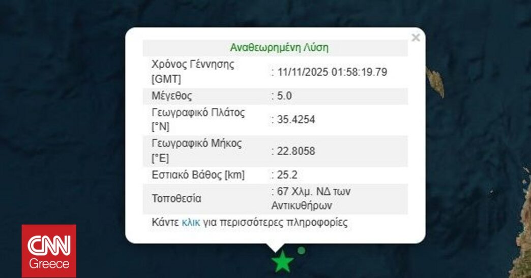 Σεισμός 5 βαθμών της κλίμακας Ρίχτερ σημειώθηκε τα ξημερώματα της Τρίτης (11/11) ακοικτά των Αντικυθήρων και απόσταση 301 χιλιόμετρα από την Αθήνα.