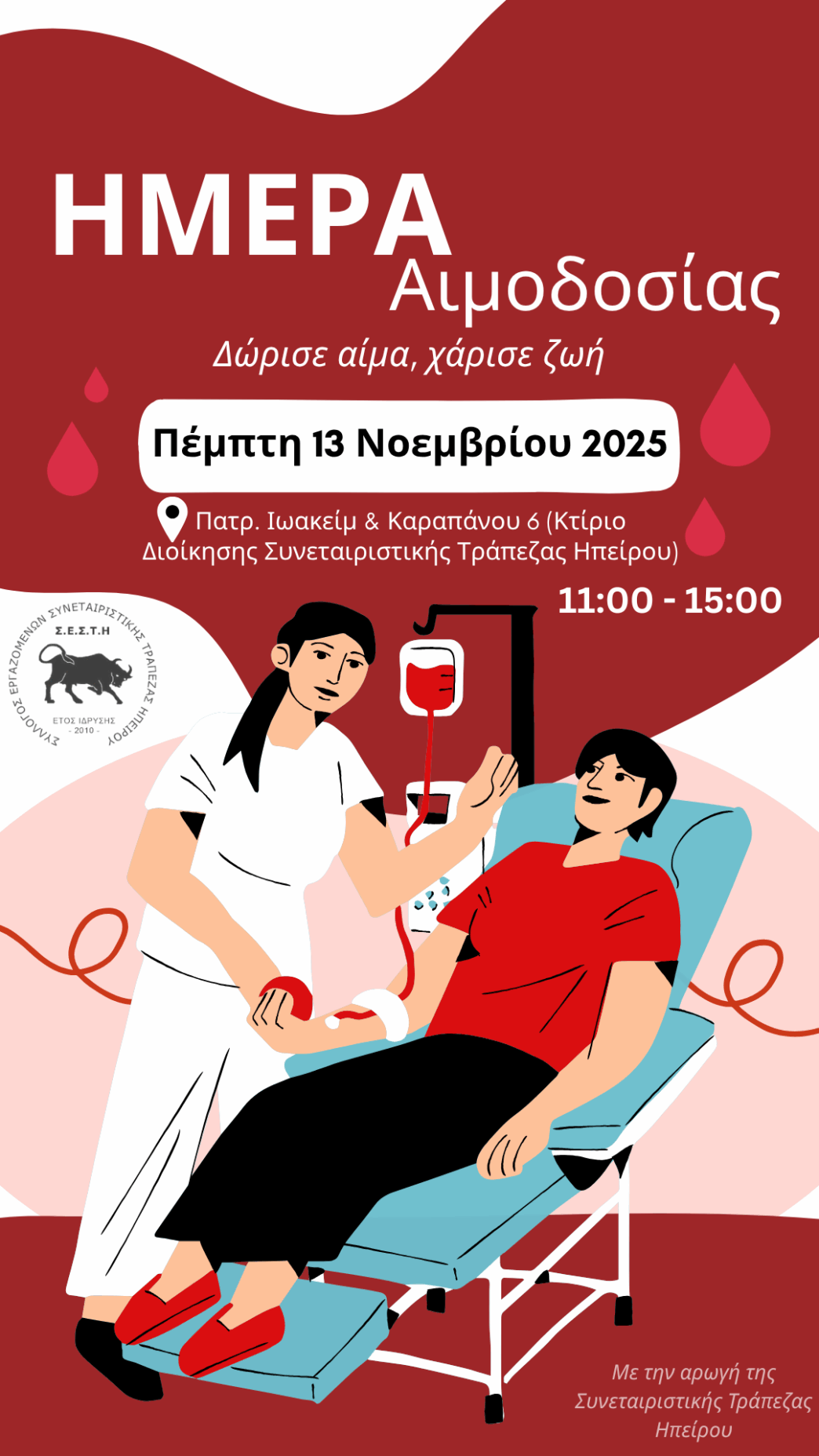 Το Δ.Σ. του Συλλόγου, κατόπιν πρωτοβουλίας του και με την αρωγή και συνεργασία της Διοίκησης της Συνεταιριστικής Τράπεζας Ηπείρου Συν.Πε., διοργανώνει στις 13/11/2025, ημέρα Πέμπτη και ώρα 11.00 π.μ. – 15.00 μ.μ. Εθελοντική Αιμοδοσία στην Αίθουσα του Δ.Σ. (κτήριο Διοίκησης).