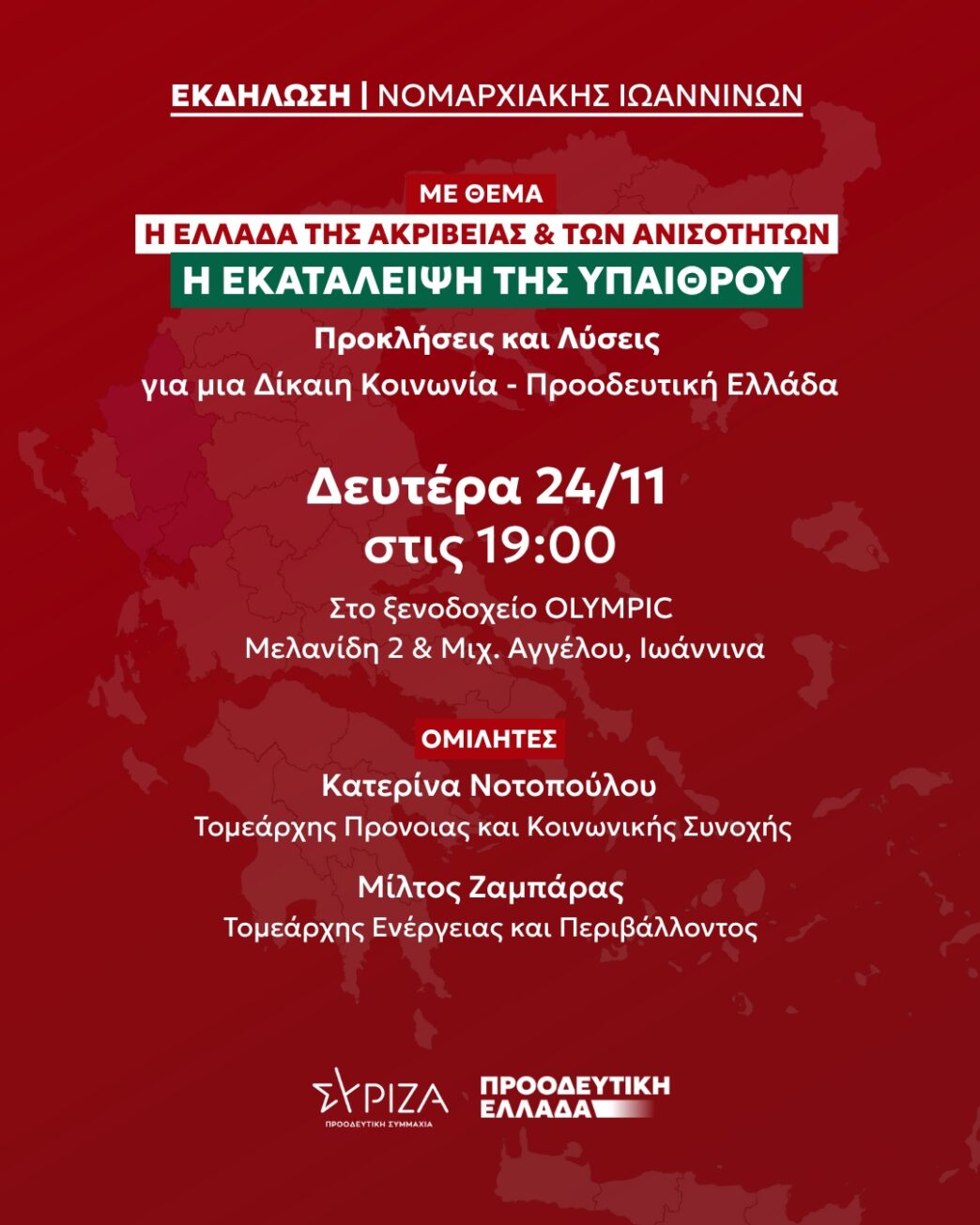 Η Νομαρχιακή Επιτροπή του ΣΥΡΙΖΑ–Προοδευτική Συμμαχία Ιωαννίνων διοργανώνει ανοιχτή εκδήλωση με θέμα: