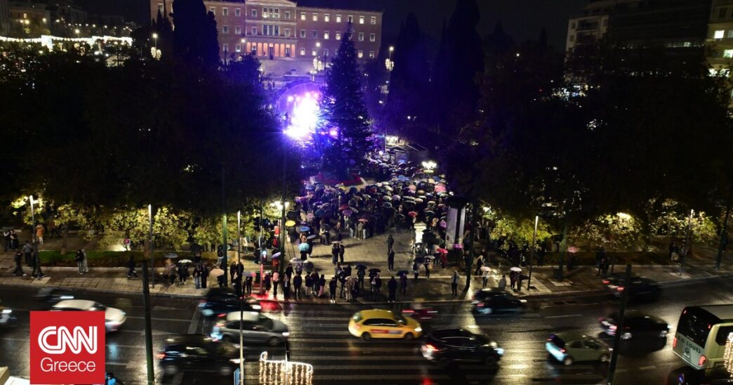 Παρά τη βροχή ο κόσμος στο Σύνταγμα είναι πολύς και συνεχώς έρχονται περισσότεροι πολίτες κάθε ηλικίας.