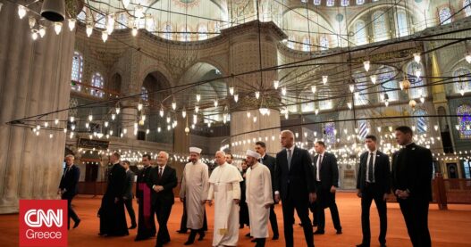 Το Μπλε Τζαμί της Κωνσταντινούπολης επισκέφθηκε το Σάββατο (29/11) ο Πάπας Λέoντας επισκέφθηκε βγάζοντας τα παπούτσια του σε ένδειξη σεβασμού, αλλά χωρίς να φανεί να προσεύχεται.