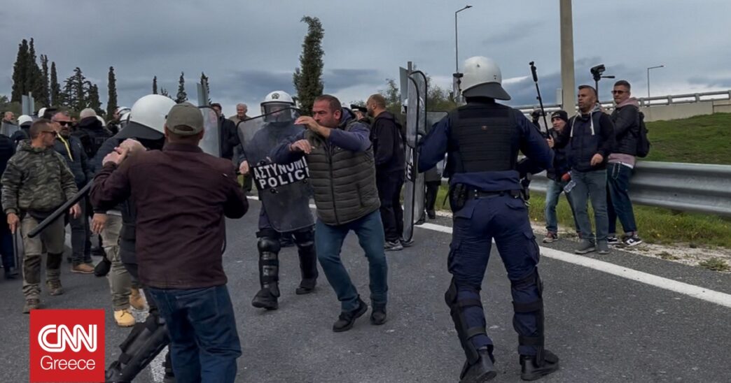 Δυνάμεις των ΜΑΤ συγκρούστηκαν με τους αγρότες προσπαθώντας να τους αποτρέψουν, χωρίς ωστόσο να τα καταφέρουν.