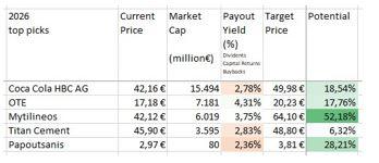 Ακολουθώντας την ίδια διαδικασία με πέρυσι, λαμβάνοντας υπόψη το πιθανό περιθώριο ανόδου προς τις τιμές-στόχους που θέτει η N. Χρυσοχοΐδης, συνδυάζοντας την αναμενόμενη απόδοση μερίσματος και εξετάζοντας τα τρέχοντα πολλαπλάσια P/E και EV/EBITDA, μαζί με ένα μέτρο για το κόστος χρηματοδότησης και δύο δείκτες για το βαθμό μόχλευσης, η ανάλυση καταλήγει στην παρακάτω λίστα κορυφαίων επιλογών.