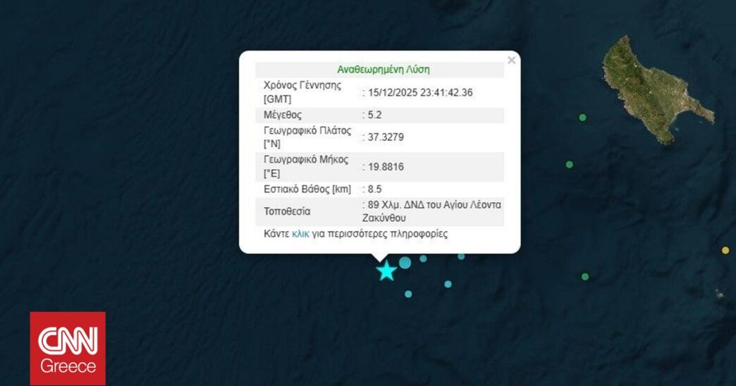 Ισχυρή σεισμική δόνηση 5,2 Ρίχτερ σημειώθηκε το βράδυ της Τρίτης (16/12) στα ανοιχτά της Ζακύνθου.