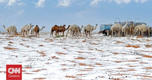 Όπως αναφέρουν μετεωρολόγοι, συστήματα χαμηλής πίεσης περνούν πάνω από τη Μέση Ανατολή χαριζοντάς μας εξαιρετικές και σπάνιες εικόνες, όπως καμήλες να διανύουν αποστάσεις μέσα στο λευκό τοπίο.