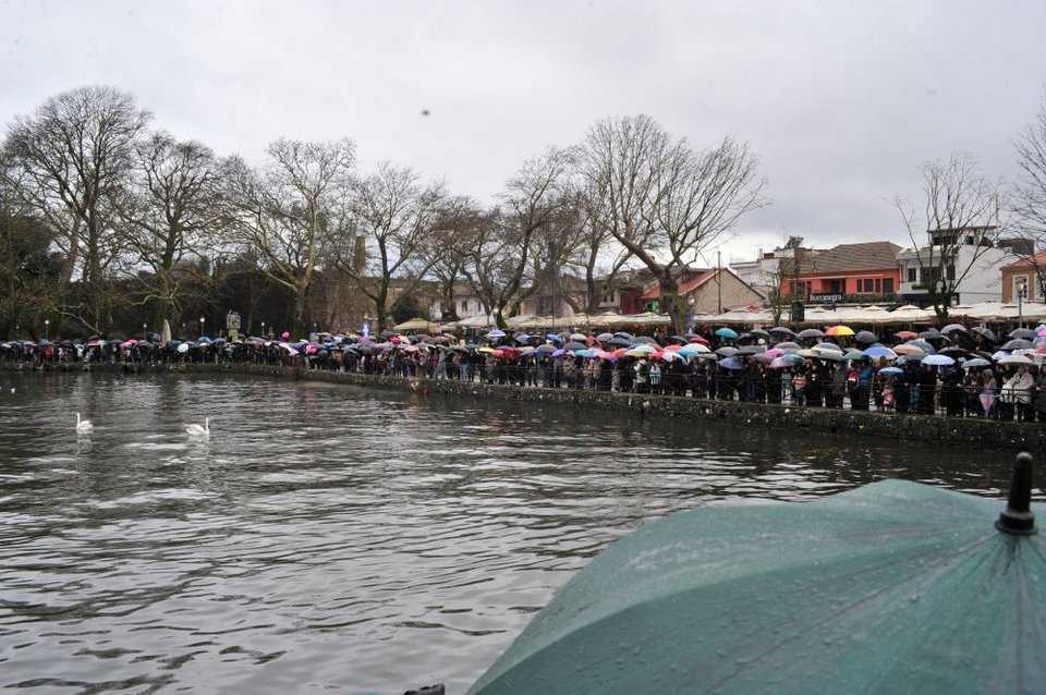 Η κακοκαιρία και η βροχή που επικράτησαν κατά τη διάρκεια της σημερινής ημέρας δεν στάθηκαν εμπόδιο στον καθιερωμένο εορτασμό των Θεοφανείων στα Ιωάννινα, όπου η πίστη και η παράδοση αποδείχθηκαν ισχυρότερες από τα καιρικά φαινόμενα. Η προσέλευση των πολιτών στην περιοχή του Μώλου ήταν εντυπωσιακή, με εκατοντάδες Γιαννιώτες να δίνουν το παρών στην πλατεία Μαβίλη προκειμένου να συμμετάσχουν στη μεγάλη γιορτή της Χριστιανοσύνης. Η ατμόσφαιρα δίπλα στη λίμνη Παμβώτιδα ήταν γεμάτη κατάνυξη, με το υγρό στοιχείο να πρωταγωνιστεί σε μια τελετή που πραγματοποιήθηκε με απόλυτη τάξη και σεβασμό στο τυπικό της ημέρας.