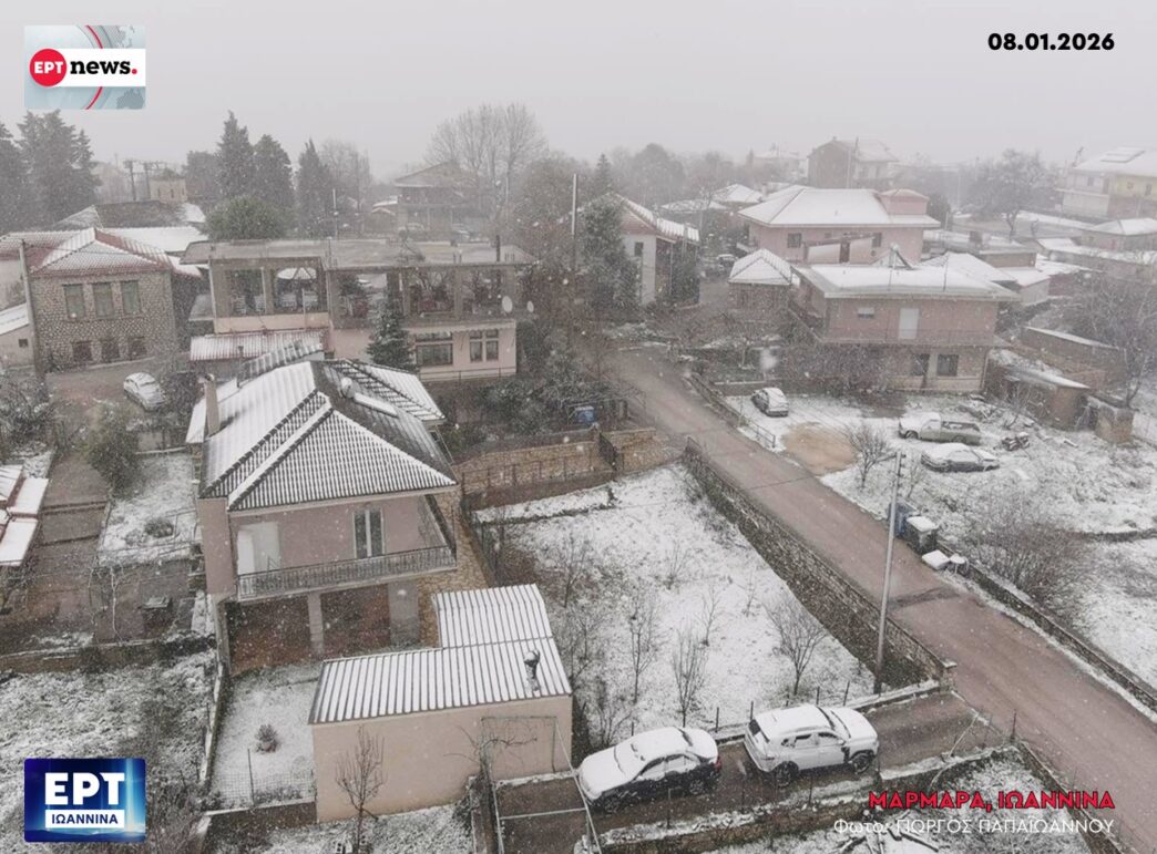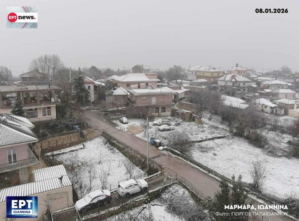 Το λεκανοπέδιο των Ιωαννίνων εισήλθε σε πλήρη χειμερινή τροχιά, με το χιόνι να κάνει την εμφάνισή του ακόμα και σε περιοχές με χαμηλό υψόμετρο, «αγκαλιάζοντας» τον αστικό ιστό. Ο οικισμός Μάρμαρα, σε απόσταση αναπνοής από το κέντρο της πόλης, μεταμορφώθηκε σε ένα λευκό σκηνικό, με τις φωτογραφίες της ΕΡΤ Ιωαννίνων να αποτυπώνουν την πυκνή χιονόπτωση που κάλυψε στέγες και αγροτικές εκτάσεις. Παρά τη χαμηλή θερμοκρασία, η καθημερινότητα των κατοίκων συνεχίζεται χωρίς αξιοσημείωτα προβλήματα, αν και το κρύο παραμένει τσουχτερό.