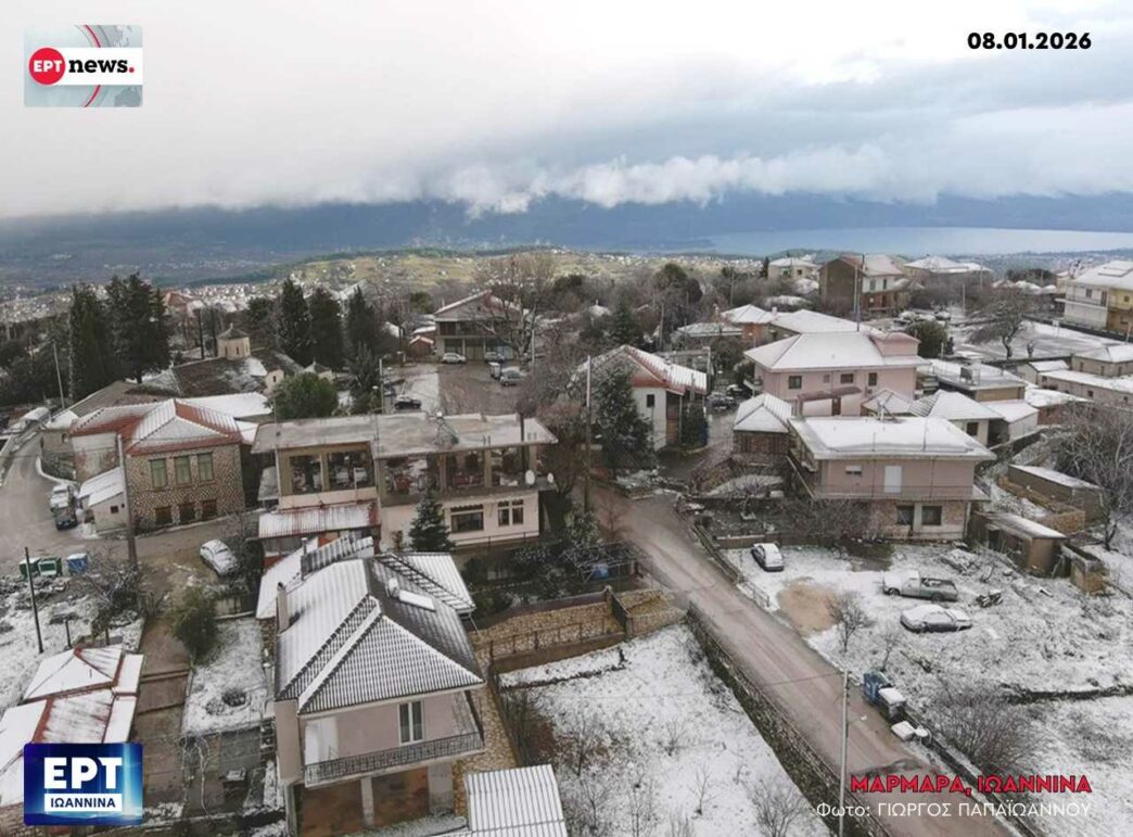Το λεκανοπέδιο των Ιωαννίνων εισήλθε σε πλήρη χειμερινή τροχιά, με το χιόνι να κάνει την εμφάνισή του ακόμα και σε περιοχές με χαμηλό υψόμετρο, «αγκαλιάζοντας» τον αστικό ιστό. Ο οικισμός Μάρμαρα, σε απόσταση αναπνοής από το κέντρο της πόλης, μεταμορφώθηκε σε ένα λευκό σκηνικό, με τις φωτογραφίες της ΕΡΤ Ιωαννίνων να αποτυπώνουν την πυκνή χιονόπτωση που κάλυψε στέγες και αγροτικές εκτάσεις. Παρά τη χαμηλή θερμοκρασία, η καθημερινότητα των κατοίκων συνεχίζεται χωρίς αξιοσημείωτα προβλήματα, αν και το κρύο παραμένει τσουχτερό.