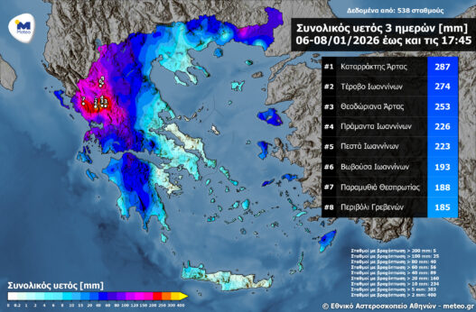 Στην κορυφή της λίστας των περιοχών που δέχθηκαν τις ισχυρότερες βροχοπτώσεις βρέθηκε ο Καταρράκτης Άρτας, όπου το ύψος της βροχής εκτοξεύτηκε στα 287 χιλιοστά, νούμερο που αντιστοιχεί σε τεράστιους όγκους νερού ανά στρέμμα. Η γενικευμένη φύση της κακοκαιρίας αποτυπώνεται στο γεγονός ότι συνολικά 25 μετεωρολογικοί σταθμοί κατέγραψαν τριψήφια νούμερα υετού, ξεπερνώντας το φράγμα των 100 χιλιοστών. Η χαρτογραφική απεικόνιση της κακοκαιρίας, όπως διαμορφώθηκε μέχρι το απόγευμα της Πέμπτης 8 Ιανουαρίου, αναδεικνύει την Ήπειρο ως το επίκεντρο της υδάτινης εισβολής, με τα βουνά της περιοχής να λειτουργούν ως μαγνήτης για τα βαρομετρικά χαμηλά. Τα στοιχεία αυτά αποτελούν πολύτιμο εργαλείο για την ανάλυση των κλιματικών δεδομένων της περιόδου 2025-26, επιβεβαιώνοντας πως η δυτική Ελλάδα παραμένει η περιοχή με τη μεγαλύτερη ετήσια συσσώρευση νερού, ακόμη και υπό συνθήκες ακραίων μετεωρολογικών εξάρσεων.