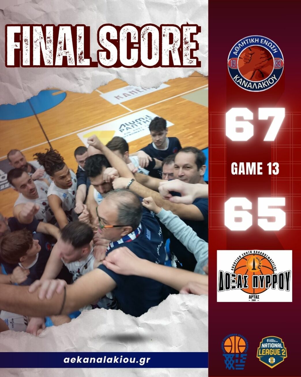 Σε μια αναμέτρηση που εξελίχθηκε σε πραγματική δοκιμασία νεύρων, η Α.Ε. Καναλακίου πέτυχε μια σπουδαία εντός έδρας νίκη, επικρατώντας της Δόξας Πύρρου Άρτας με το οριακό 67-65. Το παιχνίδι, που διεξήχθη στο πλαίσιο της 13ης αγωνιστικής για τον 1ο Όμιλο της National League 2, επιβεβαίωσε τη δυναμική των γηπεδούχων, οι οποίοι παρά τις εναλλαγές στο σκορ, κατάφεραν να διατηρήσουν την ψυχραιμία τους στα κρίσιμα τελευταία λεπτά. Η ομάδα του Καναλακίου έδειξε από νωρίς τις διαθέσεις της, κλείνοντας το πρώτο δεκάλεπτο με ένα μικρό προβάδισμα, όμως οι φιλοξενούμενοι από την Άρτα αντέδρασαν άμεσα και πήγαν στα αποδυτήρια για το ημίχρονο έχοντας το προβάδισμα με έναν πόντο διαφορά.
