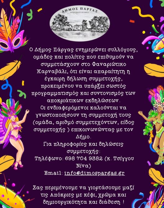Η αντίστροφη μέτρηση για το Φαναριώτικο Καρναβάλι έχει ήδη ξεκινήσει, με τον Δήμο Πάργας να θέτει σε πλήρη εφαρμογή τον οργανωτικό σχεδιασμό για τη μεγάλη αποκριάτικη γιορτή του 2026. Η δημοτική αρχή απευθύνει ένα ανοιχτό και θερμό κάλεσμα προς όλους τους τοπικούς συλλόγους, τις ομάδες πολιτών, τα σχολεία αλλά και τους μεμονωμένους δημότες, προκειμένου να δηλώσουν έγκαιρα τη συμμετοχή τους στη φετινή παρέλαση.