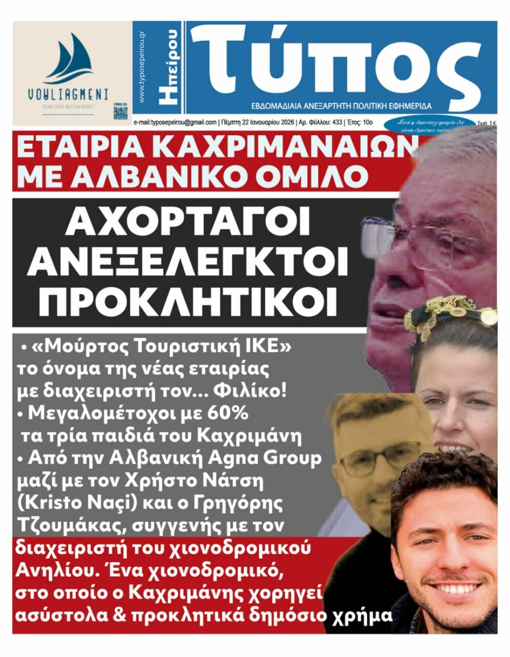 Στο επίκεντρο του πρωτοσέλιδου βρίσκονται αναφορές και ερωτήματα που, σύμφωνα με το ίδιο το μέσο, κυκλοφορούν εδώ και χρόνια στον δημόσιο διάλογο και αφορούν φερόμενες επιχειρηματικές δραστηριότητες μελών της οικογένειας του Περιφερειάρχη Ηπείρου Αλέξανδρου Καχριμάνη, τόσο εντός όσο και εκτός Ελλάδας.