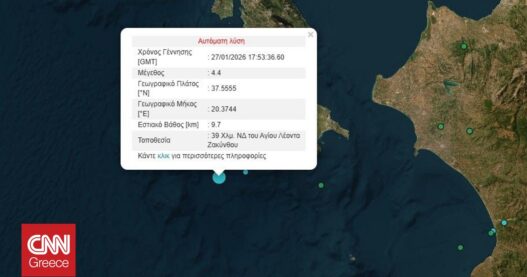 Σεισμική δόνηση 4,4 Ρίχτερ σημειώθηκε το βράδυ της Τρίτης (27/1) στα ανοιχτά της Ζακύνθου.