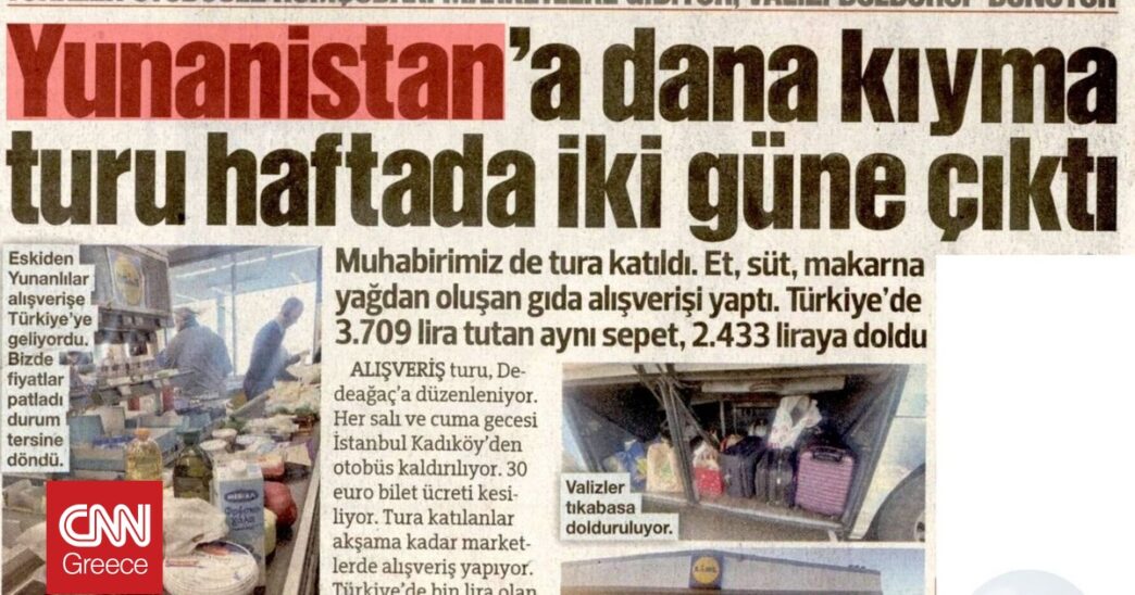 Σύμφωνα με πρωτοσέλιδο εφημερίδας της γείτονος, Τούρκοι χρησιμοποιούν τα δρομολόγια λεωφορείων δύο φορές την εβδομάδα για να έρθουν στην Ελλάδα και να αγοράσουν βοδινό κιμά.