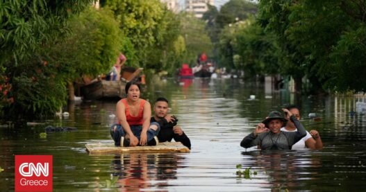 Πολίτες μεταφέρονται με βάρκες σε πλημμυρισμένο δρόμο της Κολομβίας.