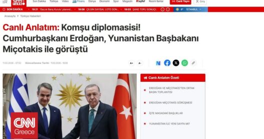 Yeni Şafak: Το live ρεπορτάζ κατέγραψε βασικά σημεία από την κοινή συνέντευξη Τύπου μετά τη συνάντηση με τον Κυριάκο Μητσοτάκη, με αιχμή τον στόχο για το διμερές εμπόριο και τη διατήρηση ανοιχτών διαύλων. Ξεχώρισε η αναφορά ότι Αιγαίο και Ανατολική Μεσόγειος συζητήθηκαν «ανοιχτά και ειλικρινά», ενώ παρατίθενται και σύντομα σημεία από τις δηλώσεις Μητσοτάκη για τη σημασία του διαλόγου.