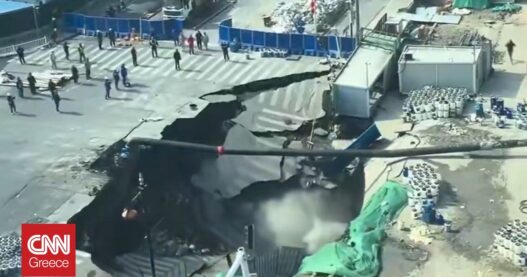 Σε βίντεο από κάμερα ασφαλείας φαίνεται καθαρά η στιγμή που μεγάλο κομμάτι του οδοστρώματος καταρρέει, με αποτέλεσμα να εξαφανιστεί σε δευτερόλεπτα ό,τι υπήρχε στο σημείο.