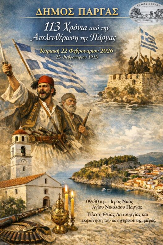 Ο Δήμος Πάργας τιμά μια από τις λαμπρότερες σελίδες της τοπικής ιστορίας, συμπληρώνοντας 113 χρόνια από την απελευθέρωσή του από την οθωμανική κυριαρχία. Στις 23 Φεβρουαρίου 1913, η Πάργα γύρισε σελίδα, αφήνοντας πίσω της αιώνες σκλαβιάς, και αυτό το ιστορικό ορόσημο θα εορταστεί την Κυριακή 22 Φεβρουαρίου 2026. Η δημοτική αρχή απευθύνει κάλεσμα σε όλους τους πολίτες να συμμετάσχουν στις προγραμματισμένες εκδηλώσεις, οι οποίες θα λάβουν χώρα στον Ιερό Ναό Αγίου Νικολάου Πάργας με ώρα έναρξης τις 09:30 π.μ.