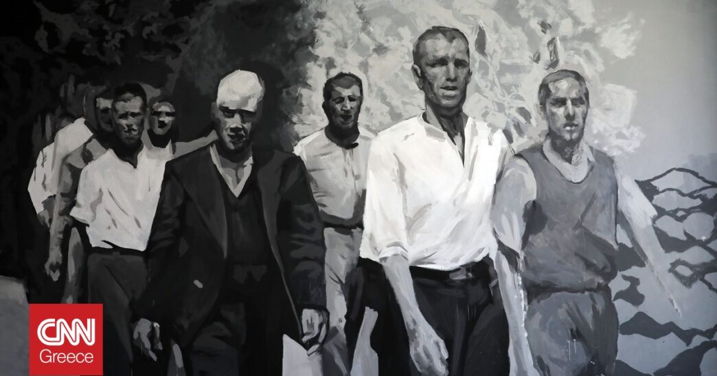 Η τοιχογραφία που βρίσκεται στον χώρο του κυλικείου της Σχολής είναι εμπνευσμένη από μια από τις φωτογραφίες που είδαν πρόσφατα το φως της δημοσιότητας, στην οποία ορισμένοι από τους 200 προχωρούν με το κεφάλι ψηλά και χαμογελαστοί πηγαίνοντας προς τον τόπο της εκτέλεσης.