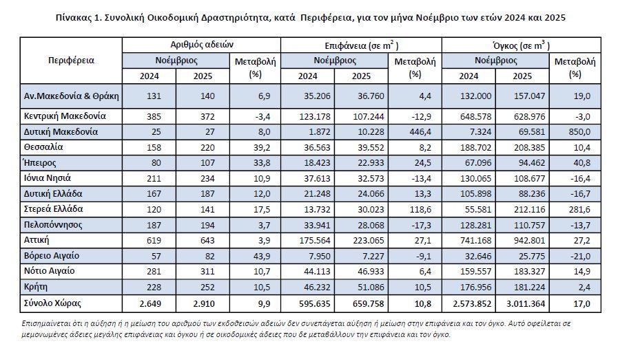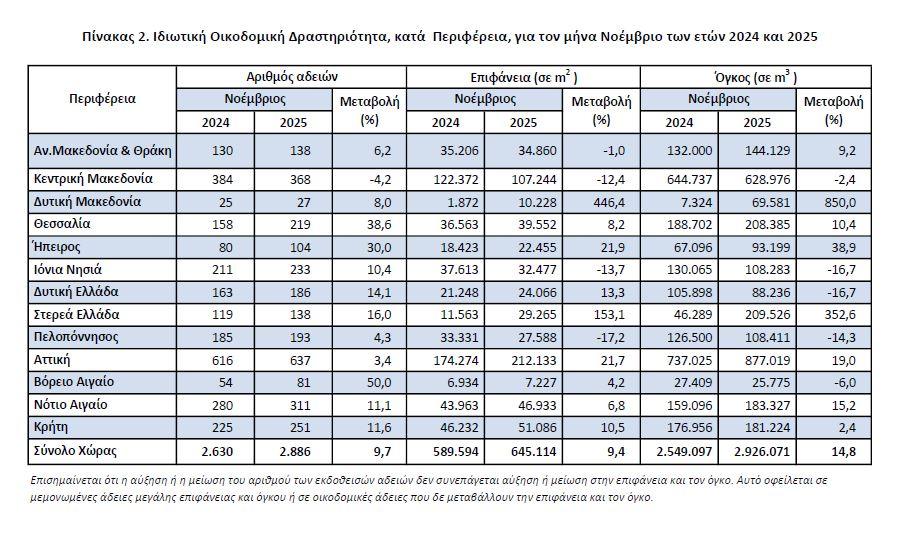 Οι εκδοθείσες άδειες Ιδιωτικής Οικοδομικής Δραστηριότητας, στο σύνολο της Χώρας, κατά τον μήνα Νοέμβριο 2025 ανήλθαν σε 2.886 οικοδομικές άδειες, που αντιστοιχούν σε 645.114 m2 επιφάνειας και 2.926.071 m3 όγκου, παρουσιάζοντας αύξηση κατά 9,7% στον αριθμό των οικοδομικών αδειών, αύξηση κατά 9,4% στην επιφάνεια και αύξηση κατά 14,8% στον όγκο, σε σχέση με τον αντίστοιχο μήνα του 2024.