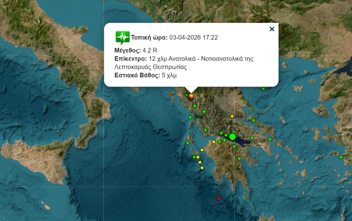 Ακόμη μια σεισμική δόνηση της τάξεως των 4.2 βαθμών της κλίμακας Ρίχτερ σημειώθηκε το μεσημέρι της Παρασκευής, 3 Απριλίου 2026, στην ευρύτερη περιοχή της Ηπείρου, προκαλώντας αναστάτωση στους κατοίκους της βορειοδυτικής Ελλάδας.