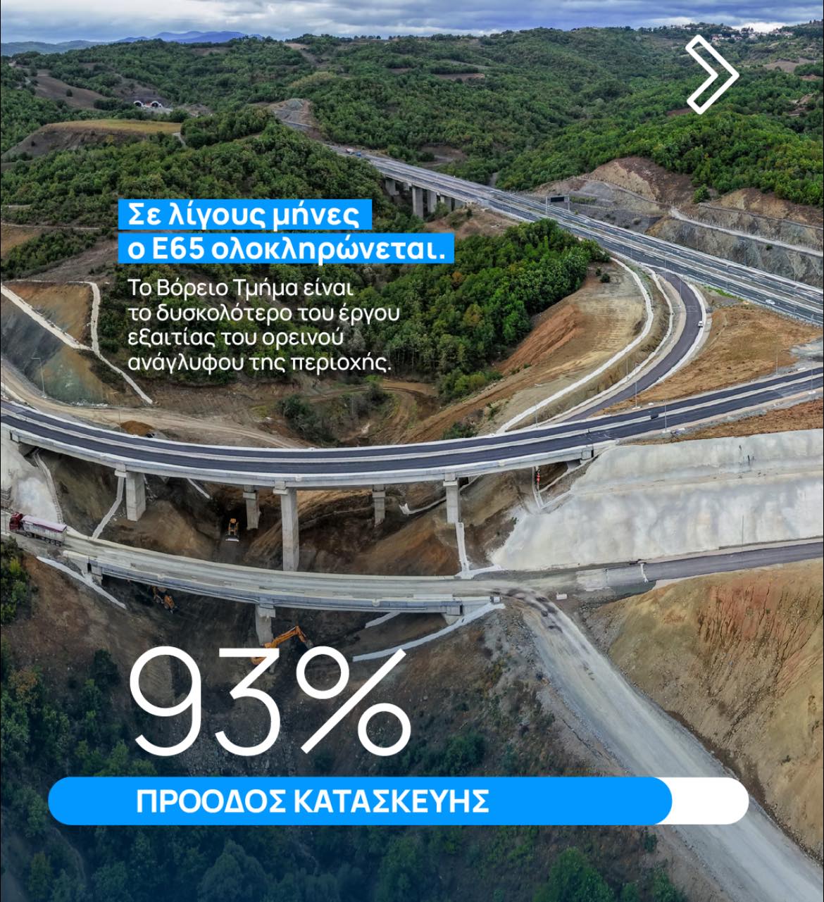 Σύμφωνα με το typosepeirou.gr, οι εργασίες εξελίσσονται με εξαιρετικά εντατικούς ρυθμούς, με τον επίσημο στόχο για την παράδοση του αυτοκινητοδρόμου εντός του προσεχούς Ιουνίου.να τοποθετείται εντός του προσεχούς Ιουνίου. Το συγκεκριμένο τμήμα του Ε65 θεωρείται στρατηγικής σημασίας, αφού αποτελεί τον συνδετικό κρίκο που θα ενώσει απευθείας τη Θεσσαλία με την Εγνατία Οδό, εκμηδενίζοντας τις αποστάσεις και ενισχύοντας κατακόρυφα τα επίπεδα οδικής ασφάλειας σε μια περιοχή με δύσκολη γεωμορφολογία.