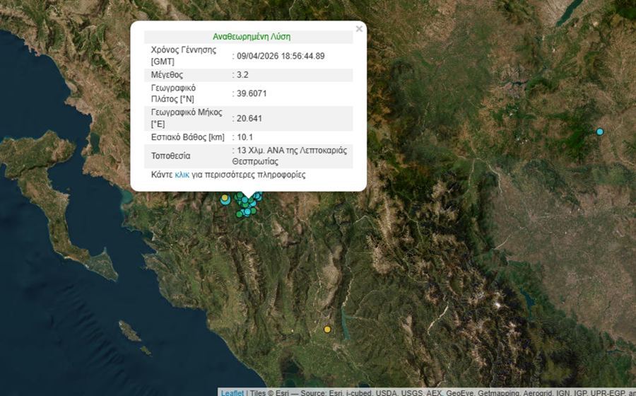 Σεισμός σημειώθηκε το βράδυ της Μ. Πέμπτης κοντά στη Λεπτοκαρυά της Θεσπρωτίας.