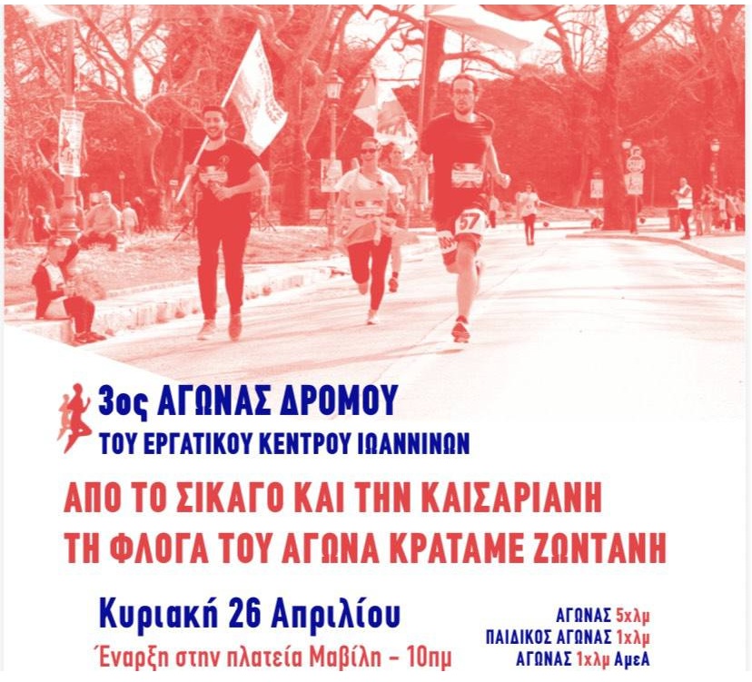 Με έναν ισχυρό συμβολισμό που γεφυρώνει την ιστορική μνήμη με τους σύγχρονους κοινωνικούς αγώνες, το Εργατικό Κέντρο Ιωαννίνων προετοιμάζεται για τον 3ο Αγώνα Δρόμου, μια πρωτοβουλία που έχει γίνει πλέον θεσμός για την πόλη. Σύμφωνα με το typosepeirou.gr, η διοργάνωση θα λάβει χώρα την Κυριακή 26 Απριλίου 2026, με το σημείο εκκίνησης να ορίζεται στην πλατεία Μαβίλη στις 10:00 το πρωί. Η δράση αυτή εντάσσεται στον ευρύτερο προγραμματισμό για τον εορτασμό της Εργατικής Πρωτομαγιάς και επιδιώκει να αναδείξει τη διαχρονική συνέχεια της πάλης της εργατικής τάξης, συνδέοντας νοητά τη θυσία των εργατών στο Σικάγο το 1886 με τους 200 κομμουνιστές της Καισαριανής το 1944.