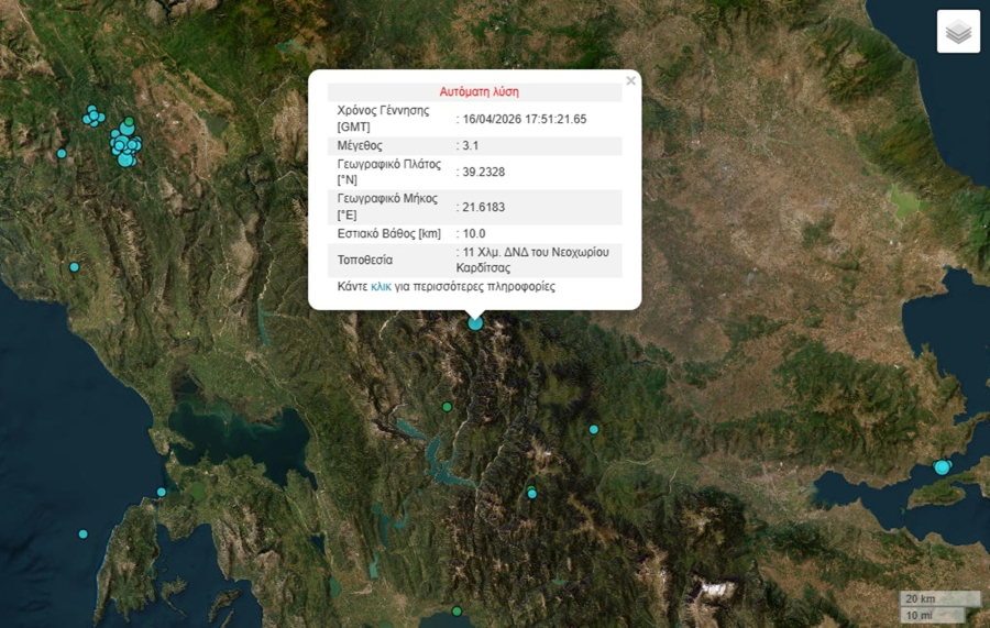 Σύμφωνα με την αυτόματη λύση του Γεωδυναμικού Ινστιτούτου, στις 20:51 σημειώθηκε δόνηση 3,1 Ρίχτερ στην Καρδίτσα.