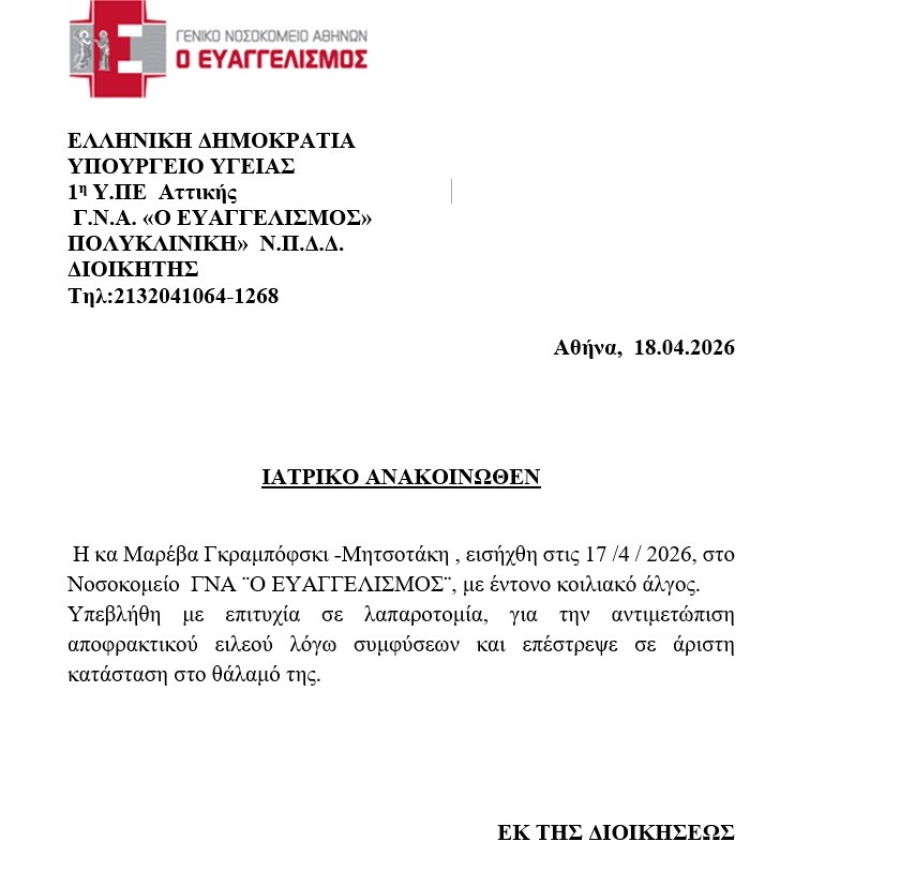 «Η κα Μαρέβα Γκραμπόφσκι -Μητσοτάκη, εισήχθη στις 17/4/2026, στο Νοσοκομείο ΓΝΑ “Ο ΕΥΑΓΓΕΛΙΣΜΟΣ”, με έντονο κοιλιακό άλγος.